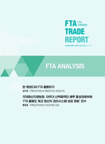 FTA 무역리포트 September 2022 Vol. 03 (통권 39호) FTA ANALYSIS 한-캄보디아 FTA 활용하기 김수정 국제원산지정보원 활용연구팀 선임연구원 국제원산지정보원, 아주대 산학협력단 페루 통상관광부에 ‘FTA 활용도 제고·원산지 관리시스템 성공 경험’ 전수 황정훈 국제원산지정보원 정보분석팀 팀장